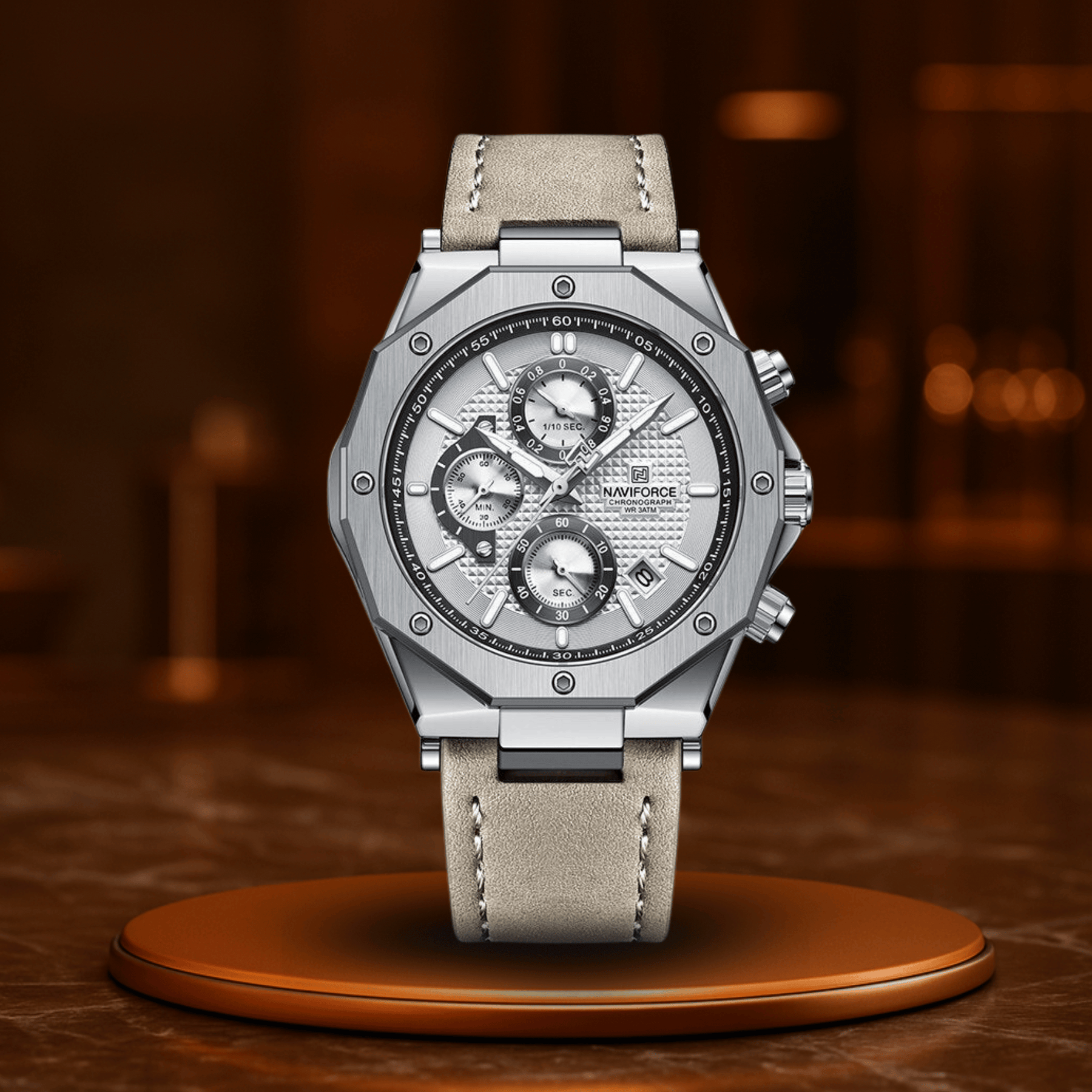 The Ironhide Chrono is more than just a timekeeper – it’s a statement to the world. Built for men who make no compromises, it unites the resilience of military material with the elegance of a modern watch case. The robust leather strap sits comfortably, and the 42 mm case is present without being flashy – just like the wearer himself.